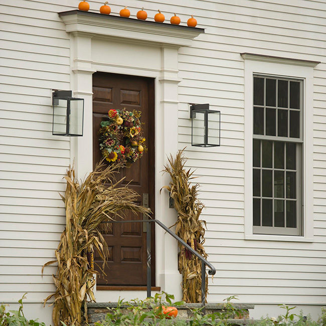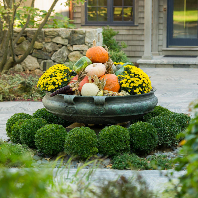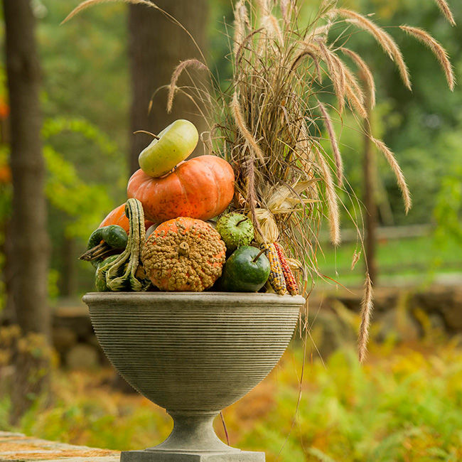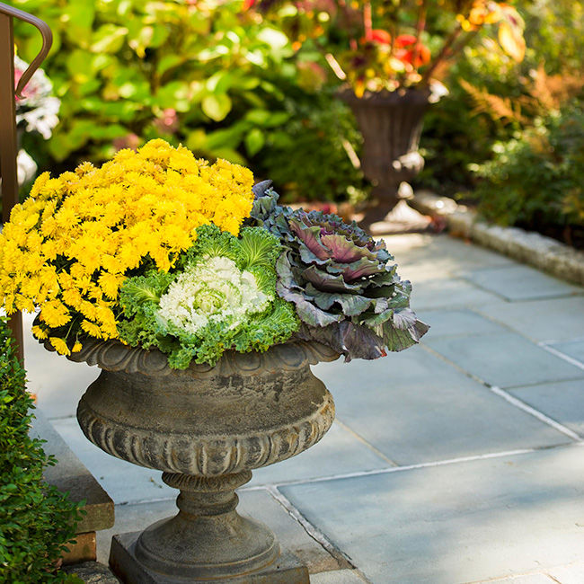 Fall’s rich color palette is embraced with cabbages, corn stalks, jewel-toned mums, gourds, and pumpkins.